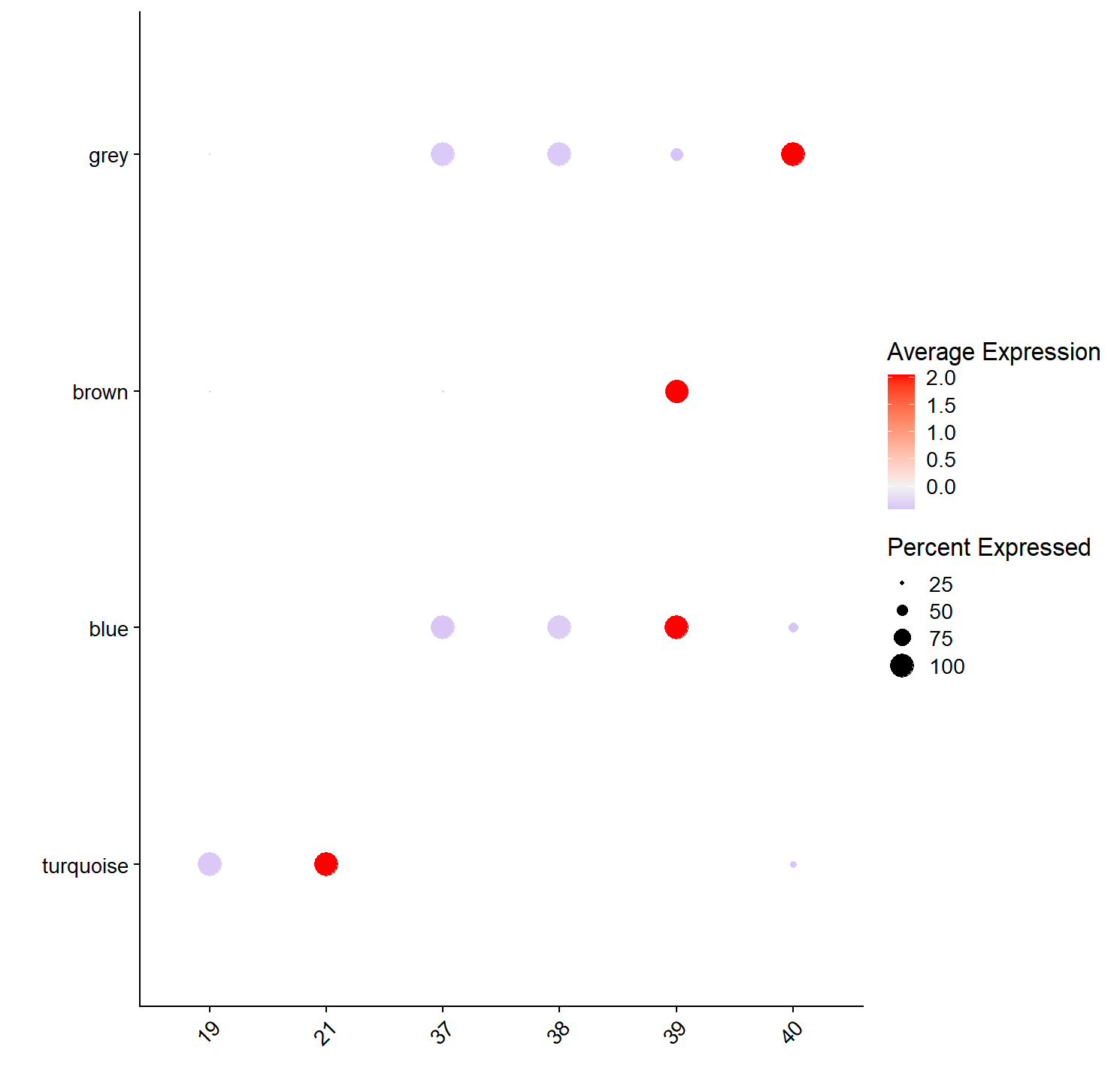 p <- DotPlot(subdata, features=mods, group.by = 'seurat_clusters', dot.min=0.1) | |