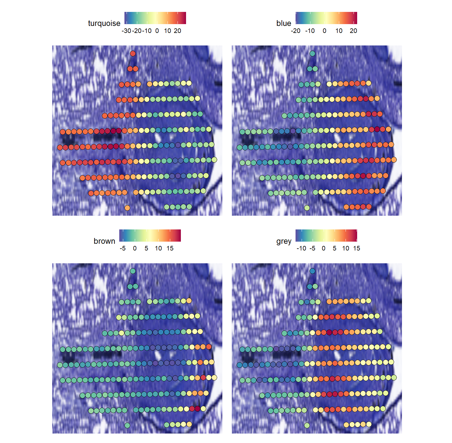 ##Here we visualize module eigengenes using the Seurat functions DotPlot and SpatialFeaturePlot. | |