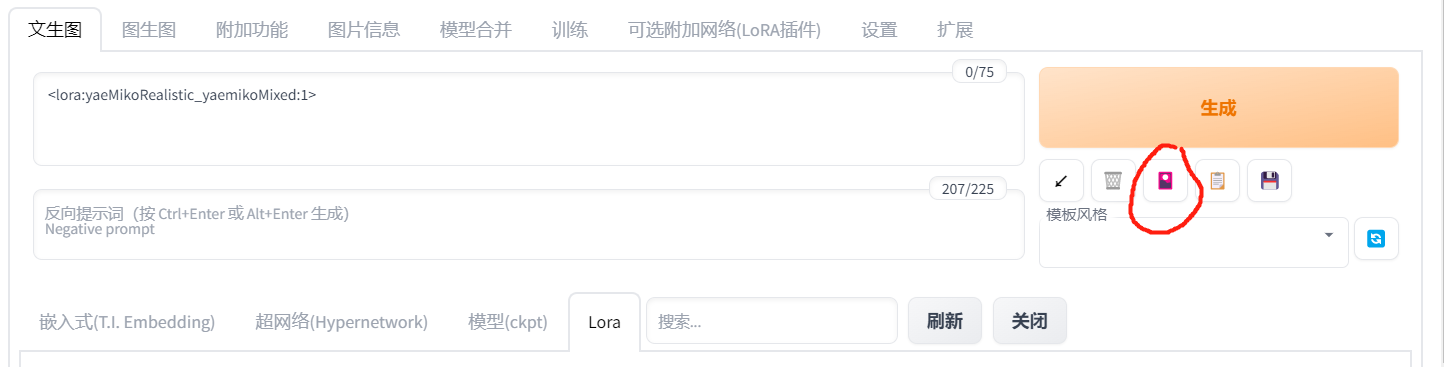 下载好的模型文献放到 models/Lora 文件夹下,在 generate 下方有个红色按钮点击之后即可使用,就会看到正面 tag 出现一个 <> 的关键词,lora:yaeMikoRealistic_yaemikoMixed:1, 这个 1 代表的是权重,可以从 0 开始