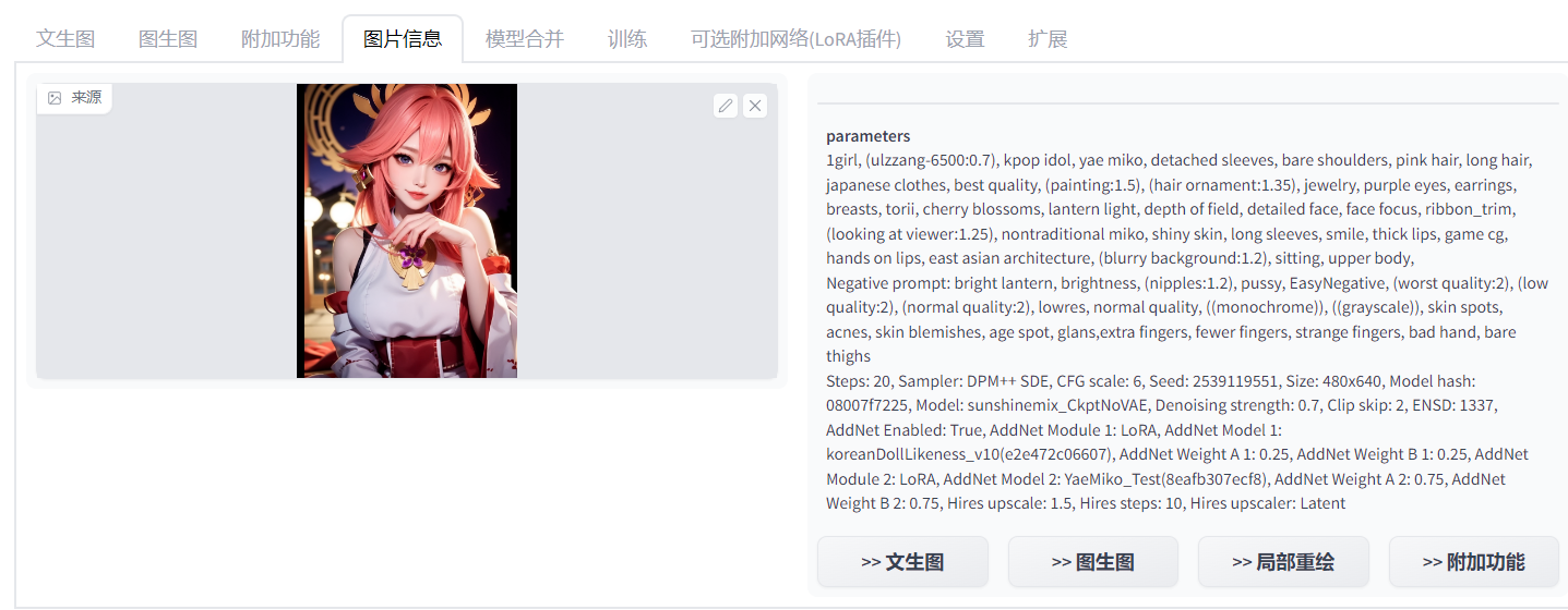 然后我们可以用 webui 的图片信息查看功能将网站上的图片拖进去查看关键词以及模型