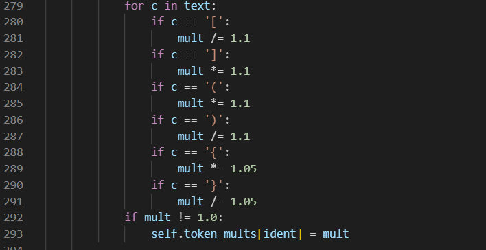 webUI 的 tag 权重是 (), 代表强化 1.1,naifu 的是 {}, 强化 1.05,所以我们在其他网站找到了现成指令有的时候是 (), 有的时候是 {}, 那么我们可以修改 modules/sd_hijack_clip.py, 加上 {} 的权重