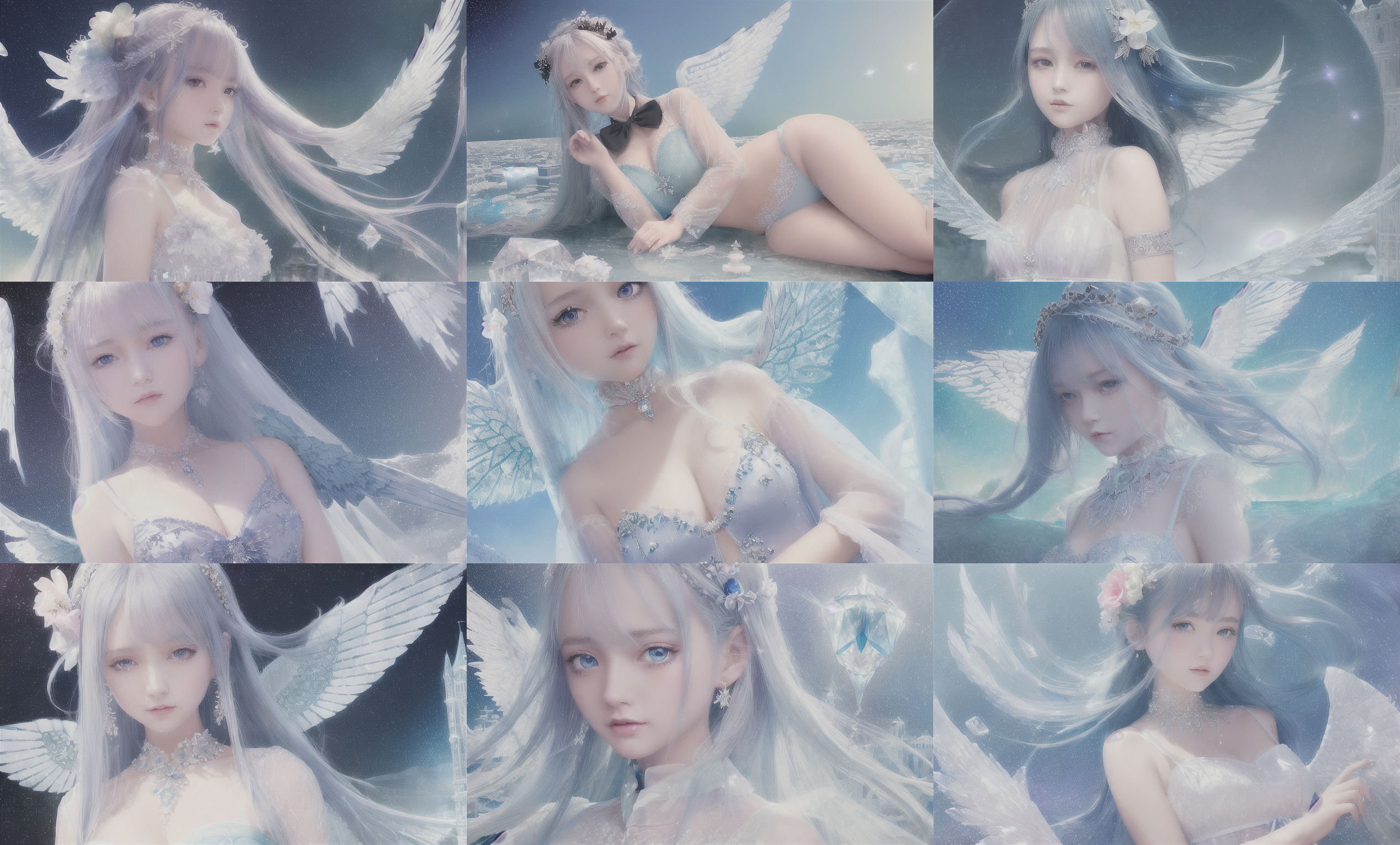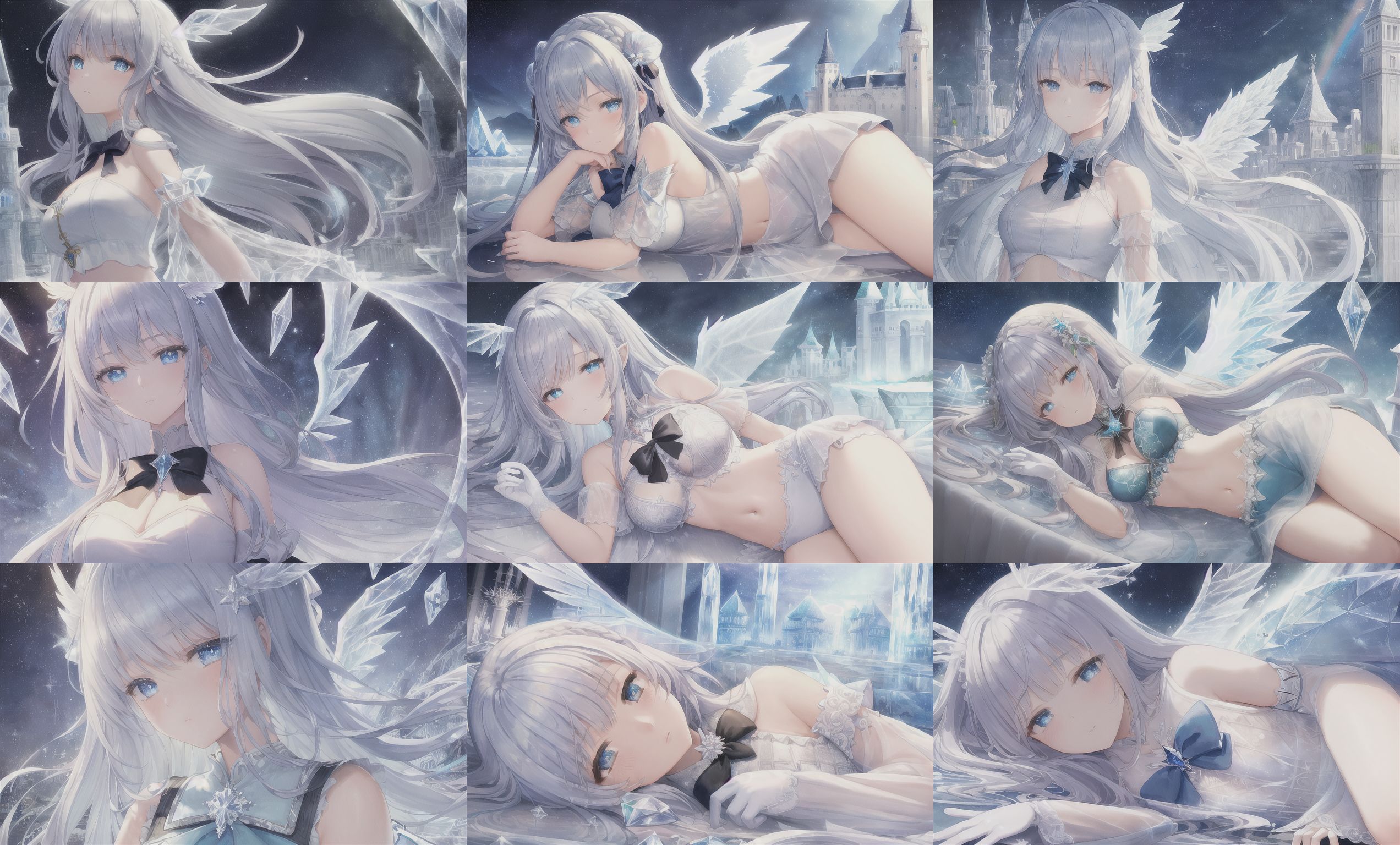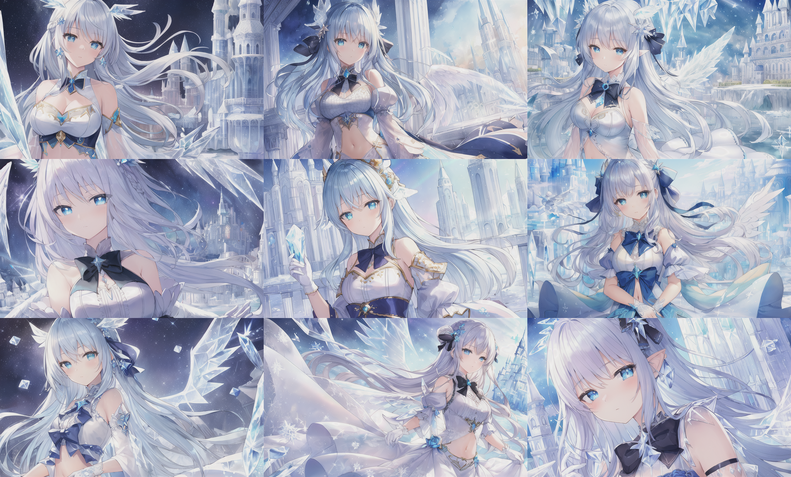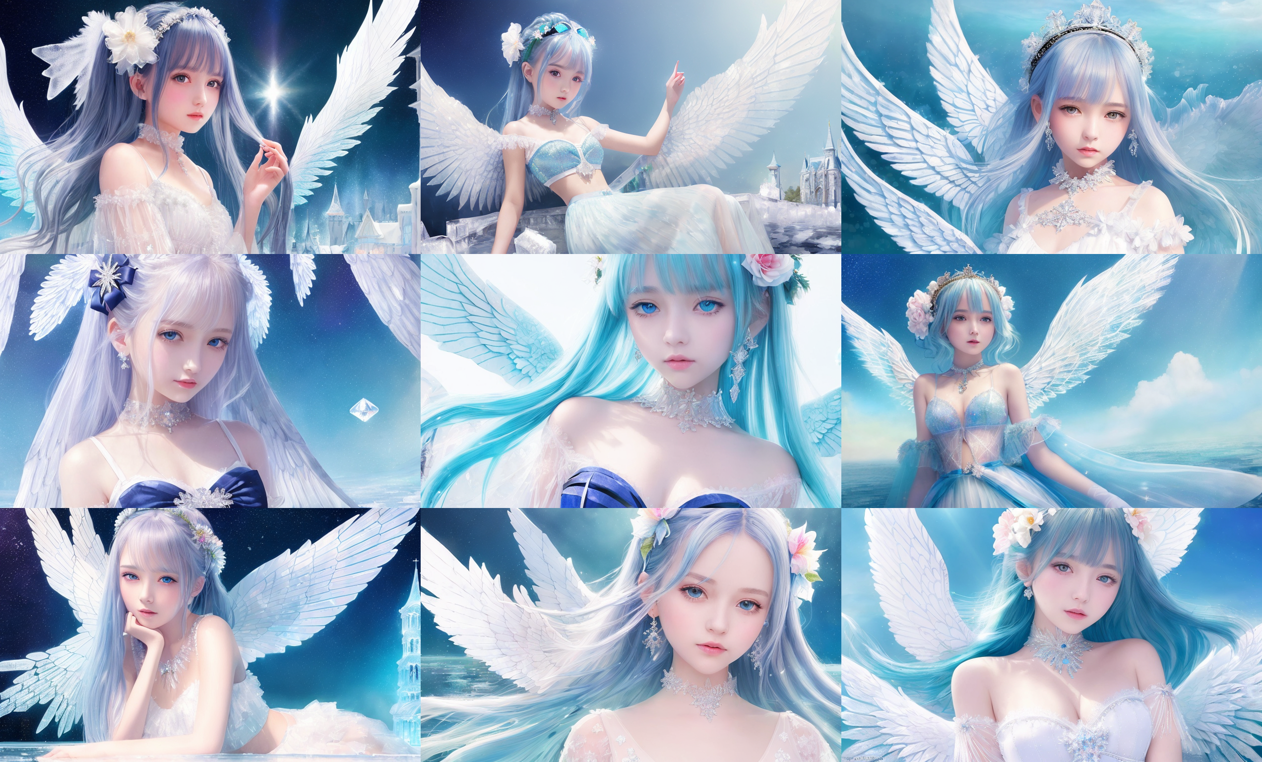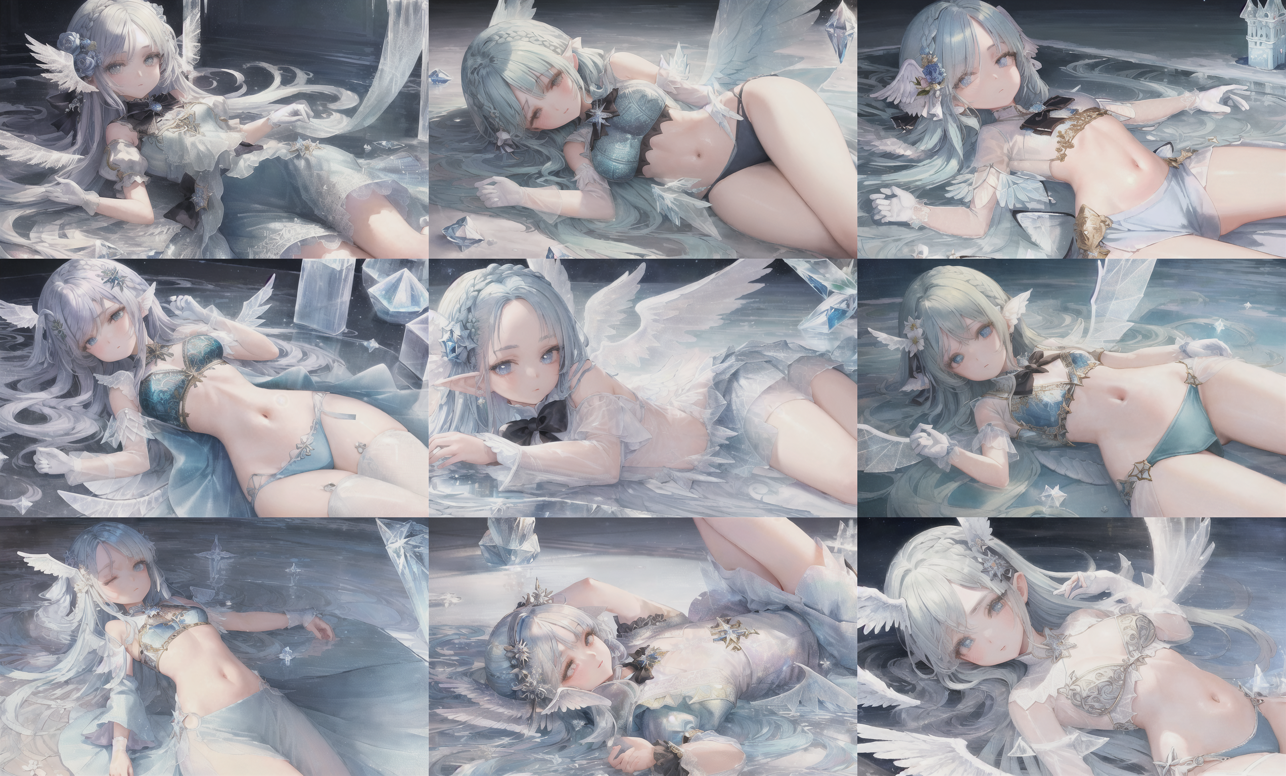 (((masterpiece))),best quality, illustration,(beautiful detailed girl),beautiful detailed glow,detailed ice,beautiful detailed water,(beautiful detailed eyes),expressionless,beautiful detailed white gloves, (floating palaces:1.2),azure hair,disheveled hair,long bangs, hairs between eyes, (skyblue dress),black ribbon,white bowties,midriff,{{{half closed eyes}}},,big forhead,blank stare,flower,large top sleeves,(((ice crystal texture wings))),{{{{{{{Iridescence and rainbow hair:2.5}}}}}}},{{{{{{detailed cute anime face}}}}}},{{loli}},{{{{watercolor_(medium)}}}},(((masterpiece)))
